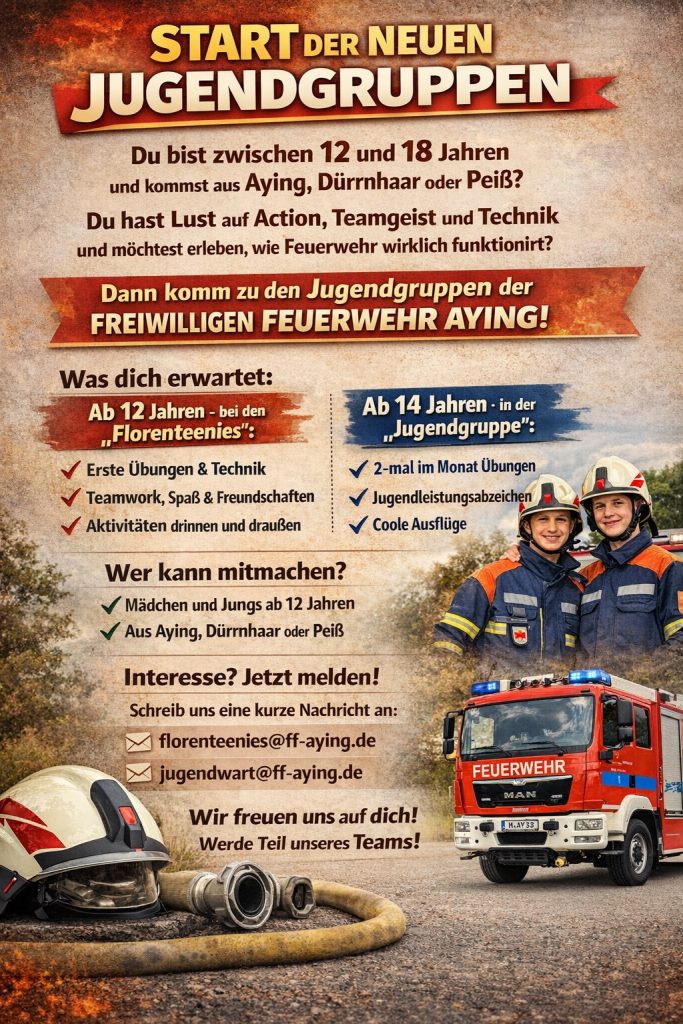 Sie wohnen in Aying, Peiß oder Dürrnhaar? Ob Alteingesessene oder Neubürger – bei uns sind alle herzlich willkommen. Werden Sie Feuerwehrfrau und Feuerwehrmann auf dem „zweiten Bildungsweg“!